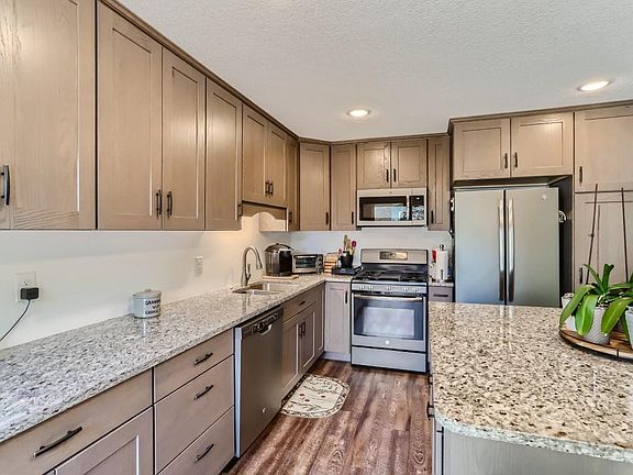 Come see this open concept end unit TH located near Elm Creek Park Reserve. Hard to find 1800+ square ft, this 3 bedroom, 2 bath home has been updated from top to bottom. Kitchen with new cabinets, granite, center island, stainless steel appliances, LVP flooring, newer carpet and flooring throughout, knockdown ceiling, recessed lights, spacious primary bedroom with double closets, ceramic tile baths, cozy gas fireplace, 6 panel doors, deck, walkout lower level, heated and insulated garage. This TH lives like a single family home. Easy access to parks, schools, shopping, and 610. Spend time enjoying Elm Creek Park Reserve and let the association take care of the lawn and snow.