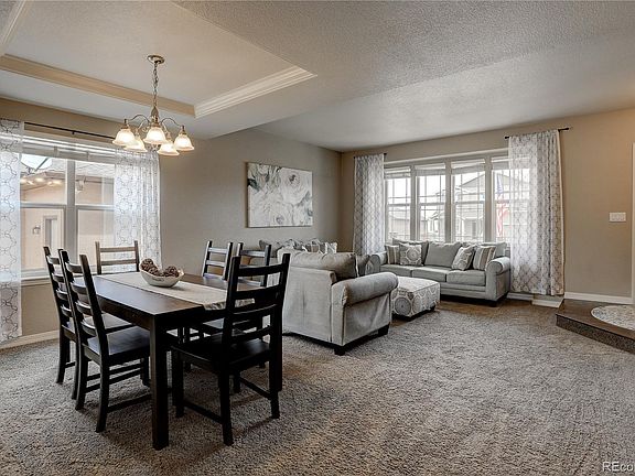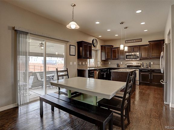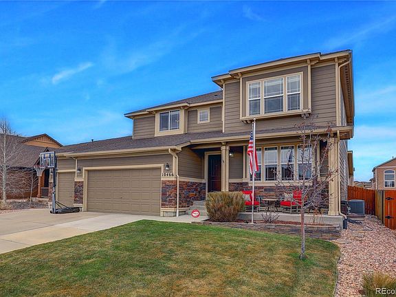 WELCOME HOME! Fabulous 2 story home in the much sought after Meridian Ranch. Fully finished, upgraded home on almost a 1/4 acre, over 3800 finished sq ft, a 3 car garage and conveniently located near schools, community center, hiking, trails and parks. The beautiful community rec. center is a real treat, that includes a fitness center, pool, activities and a playground that are included in the monthly HOA dues. From the minute you enter this well loved home, you'll notice the pride of ownership & the many upgrades.The well appointed kitchen boasts granite counters, island, nook, stainless steel appliances and a pantry. Engineered hardwood floors, formal dining room and living room! Perfect for entertaining, the open concept kitchen opens up to the spacious family room featuring a gas fireplace. This home also includes a dedicated main floor office w/ french doors.Down the hall from the family room is the powder room, laundry room and extra large bonus room/mud room that connects to the 3 car garage. The upper level features a spacious master suite, 3 additional bedrooms (2 bedrooms with walk in closets) and a guest bathroom. Head down to the basement where you'll be welcomed by a large family room (theatre screen stays), 9ft ceilings, 5th bedroom with walk-in closet and a well appointed bathroom with new shower door. You will be WOW'ed when you enter the newer $40k custom built 44 foot covered patio that includes ceiling fans, recessed lighting and the perfect area for BBQ'ing and entertaining. Outdoor entertaining at its finest with a large professionally landscaped back yard, a hot tub and a new walkway that takes you to the cozy fire pit where you can truly enjoy the beautiful Colorado outdoors. Don't forget to check out the back yard shed for all your toys! This is the one!