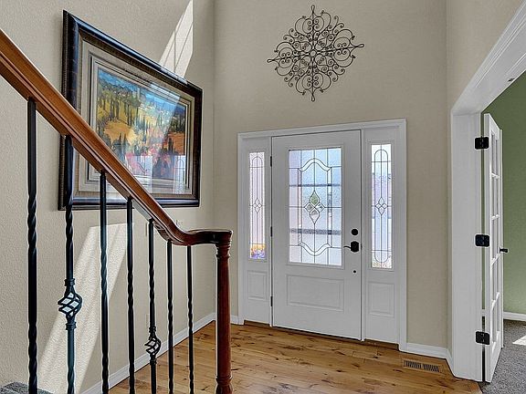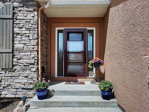 Gorgeous custom home on 1/2 acre lot w/ amazing PIKES PEAK VIEWS! Located on a quiet a cul-de-sac street in Meridian Ranch golf course community. Lovely curb appeal w/ stucco and stone exterior, and tons of elbow room! No rear neighbors! Knotty alder floors and decorative archways throughout main level, which features a sunny study w/ french doors (could be 5th bdrm), a formal dining room w/ coffered ceilings, living room w/ cozy gas fireplace, and a beautiful gourmet kitchen w/glazed maple cabinetry, granite countertops, breakfast bar, travertine tile backsplash, a large walk-in pantry, built-in desk space, and a breakfast nook w/ mountain views. Upstairs, you'll find a spacious master retreat w/ vaulted ceilings, dual-sided fireplace and fabulous master bath w/ walk-in spa shower (dual showerheads!), jetted tub, and a huge walk-in closet. More incredible Front Range views! Also located on the upper level are 2 additional LARGE bedrooms w/ vaulted ceilings and walk-in closets, as well as a full bath. The finished basement is an entertainers dream w/ 9' ceilings, large family room (ample space for a billiards table), a wet bar, AND a home theater room with stadium seating! (Shuffleboard, theatre seating and speakers are included!) One additional bedroom and a full bath complete the basement level. Outside, you'll absolutely fall in love w/ the fully covered stamped concrete patio w/ outdoor fireplace and private alcove - perfect for unwinding and watching the Colorado mountain sunsets w/ a glass of wine! Enormous rear yard is fully dog fenced, and also has a relaxing water feature. Additional highlights of this incredible home inc: Newer roof 2020. Newer hot water heater. Brand new kitchen refrigerator. Dual zone climate w/ 2 furnaces and AC units. Hot water recirculator. Whole house humidifier. Wrought iron staircase balusters. Cabinets and sink in laundry room. 8' garage doors. Auto sprinklers. Holiday lighting package. Community rec center, indoor/outdoor pools!