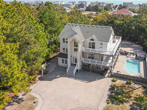OVER $100,000 GROSS REVENUES for FIVE CONSECUTIVE YEARS! "Stella Maris of Corolla," a true star of the sea, is affectionately given this name by the owners who have thoroughly loved the rewards of family visits and exceptional investment performance through ownership of this lovely home. Sadly, ages and stages of life call them to move on to the next chapters ahead. Centrally located in the Whalehead community, just a 4-MINUTE WALK STRAIGHT TO THE OCEANFRONT, nestled amid mature trees on a one-half-acre private lot, this expansive 8 bedroom, 5 bath home offers over 4300 sq ft of living space, perfect for gracious gatherings with family and friends. The top floor features a spacious open floor plan with a private ENSUITE and WRAPAROUND DECKS OVERLOOKING A MASSIVE PRIVATE POOL. Capture a VIEW OF THE OCEAN and enjoy SUNRISES OVER THE ATLANTIC or RELAX with an enchanting evening of stargazing from the rooftop ship’s watch deck. The second floor offers an office, TWO ensuites, and TWO additional bedrooms that share a bathroom. The ground floor boasts THREE bedrooms, entertainment areas, and a spacious rec room with a pool table, sitting area, and kitchenette that includes a full-size refrigerator and icemaker. Outside, a playground of fun awaits with a large private pool and Tiki Bar, sand volleyball court and horseshoes, basketball goal, and hot tub. Conveniently located near the Historic Corolla Village and Park, guests can easily WALK OR BIKE to explore the charming village and its historic sites. The iconic Currituck Lighthouse is also nearby, offering breathtaking views of the coast. Don't forget to visit the Corolla Wild Horses, a unique and enchanting sight that adds to the allure of this coastal retreat. With wide hallways and gracious stairways, this home warmly welcomes large groups or gently embraces you for a quiet visit with single-floor living. Don’t miss this opportunity to invest in an exquisite property, a true star of the sea, "Stella Maris"! Please see the associated documents for the stellar rental performance.