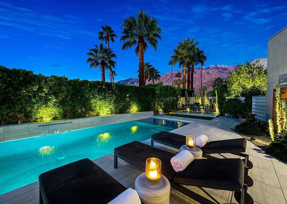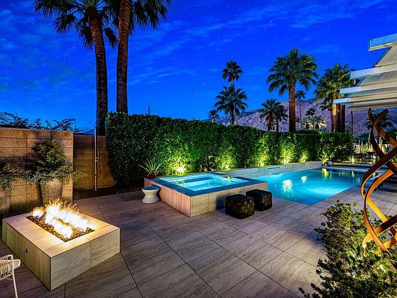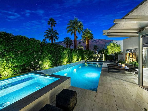 Welcome to this one-of-a-kind, SPECTACULAR home on one of the largest premium lots in the gated community of The Morrison. This property boasts a gorgeous private backyard oasis with amazing mountain views, 3 bedrooms, 3 bathrooms, and an open floor plan with an expanded kitchen and dining room. With over 2400 sq. ft. of living space, enjoy the chef's kitchen with all Thermador Pro appliances, a 12 ft. island, quartz backsplash & countertops, wine refrigerator, and an additional island with a sink. The added dining room and spacious living area have stone tiled walls. Enjoy the remodeled fireplace with a raised faux leather hearth and a set of Fleetwood sliding doors offering a seamless connection to the outdoor patio/pool. Additional amenities include hardwood flooring throughout, custom lighting, custom baseboards and crown molding throughout, a renovated powder room, Life Source whole house water filtration system, and owned solar system. The extraordinary backyard, with fabulous south and west facing mountain views, features a new, oversized pool and raised spa, with water features, custom plaster finish, and upgraded LED lighting. Outside entertaining is a must with a steel shade structure that has a lounging area with a television, ceiling fan, a misting system for hot summer days, built-in heaters for the cooler, desert winter nights, and two awnings for extra shade. A custom outdoor kitchen includes a built-in gas BBQ, refrigerator, and wine refrigerator. Revel in sunset dinners on the raised dining area surrounded by lush landscaping and framed with incredible mountain vistas. Don't miss this truly wonderful property of sophisticated design located in the heart of Palm Springs in one of the most sought-after downtown communities!