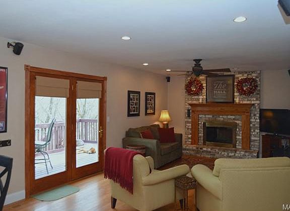 Welcome home! Great curb appeal, cul de sac, brick side walk, and front makes a grand entry! Have it all large home, nice level fenced back yard, close to shopping at Gravios Bluffs. Main level has beautiful wood floors! Stunning living room with double glass entry doors to enter. (Electric Fireplace not staying is negotiable) Kitchen has been recently updated with Recess lighting and beautiful 42"cabinets 2 big pantry cabinets that extend out too! Quarts counters, under mount sink, Whirlpool appliances! Black built in bench that will be staying (black table, 2 chairs are negotiable) Private dining room! Family room with wood burning fireplace, and French doors that lead to the deck. Upper level has Newer freesia carpeting! Large master with crown molding, his and her closets,(walk in). Master bath with ceramic tile and tiled shower! Walk out Lower level with 14x20 patio is completely finished with family room/rec room/office/laundry room (with mop sink)/ work shop! Home warranty!