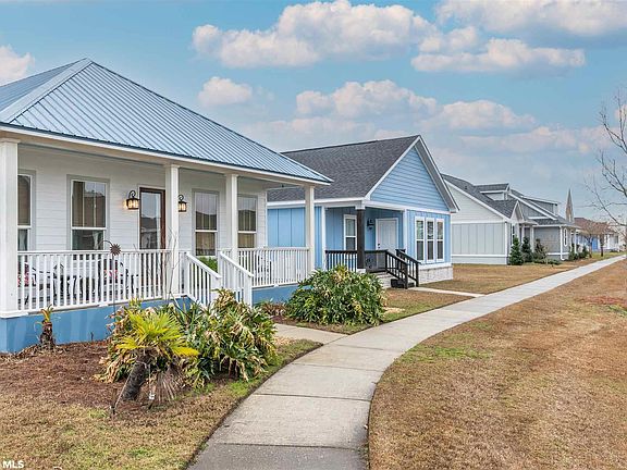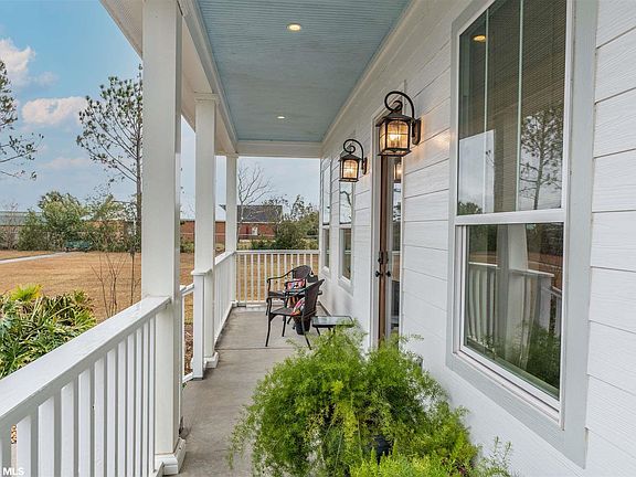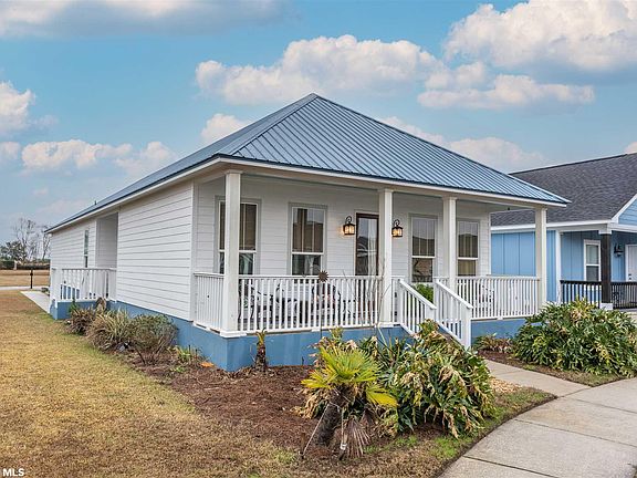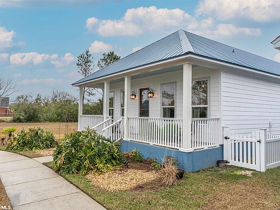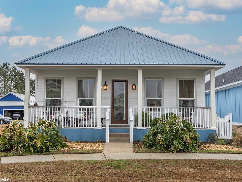 This adorable cottage with BRAND NEW metal roof is nestled in the desirable Cottages on the Greene. This coastal community is attractively designed around a spacious clubhouse and saltwater pool. The covered front porch of this home overlooks the green space and walking paths and welcomes you into this like-new home. Upon entering you will feel right at home with the hardwood floors, 10 foot high ceilings, crown molding, and an abundance of windows. In addition, this home features two more porches on the east and west sides. The chef's kitchen has granite counters, stainless steel appliances, and plenty of cabinets. This fortified home boasts 2x6 exterior walls, spray foam insulation, and high impact windows and doors. The spacious rear-entry garage is ideal for your convenient access. Located at the end of a cul-de-sac street this home feels secluded but is still close to all that you will need. Only 15 minutes from the beautiful white sand of the Gulf Coast Beaches and also abundant shopping and dining. This property will not last long, schedule a tour today!