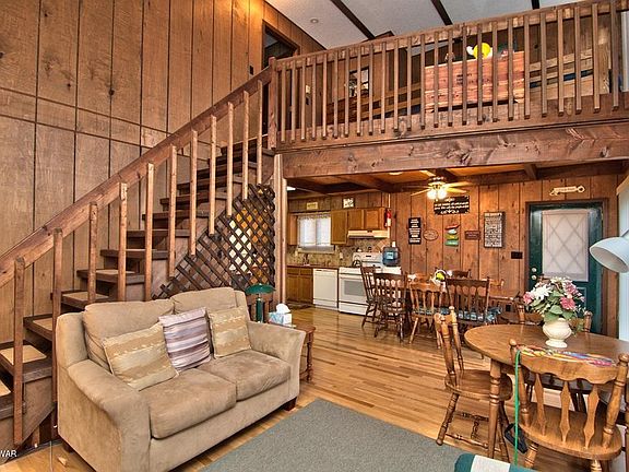 Finally! The home you've been waiting to buy! Great location in close proximity to the lakes, beach, pool, ski hill and other awesome amenities. Three finished levels including a full finished lower level with a family room with a wood stove. The main area has an open living/dining/kitchen area, hardwood floors, and a beautiful stone faced fireplace. The living room has cathedral ceilings and a loft above. The exterior has no maintenance vinyl siding, a large deck, storage shed, circular driveway and is located on a nice wooded lot. The community features include lakes, beaches, pools, tennis, basketball, ski hill, golf, indoor sports complex with fitness center, indoor tennis, an arcade, club house with restaurant and pub, camp ground, main lodge with tiki bar and more!