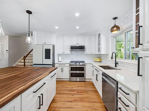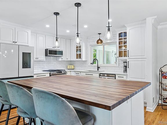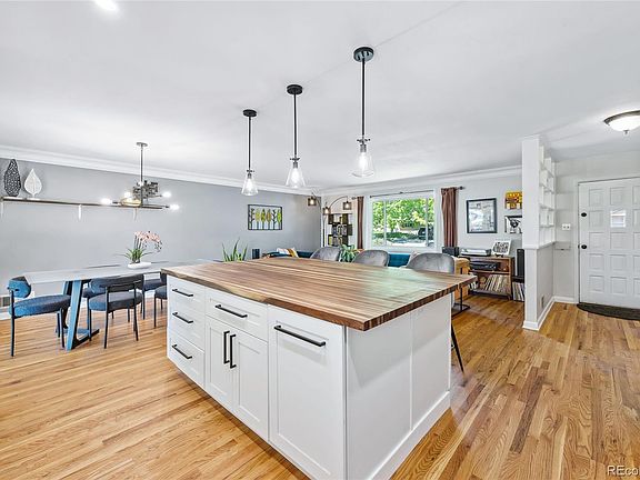 This stunning, newly remodeled home greets you with timeless elegance the moment you step across the threshold. The living and dining rooms are enhanced with crown moulding, sleek lighting, and are bathed in abundant natural light. The expansive kitchen with a large walnut island, stainless appliances, and a gas range, transitions seamlessly into its spacious dining room. The covered rear patio is the ideal space for dining al fresco or hosting outdoor events. The generously sized bedrooms provide ample personal space. Modern updates include designer baths with marble-top vanities, custom tile work, and a rain shower-head in the primary bath. Mature trees in the front yard lend to its impressive curb appeal.The walkout lower level leads to a fully fenced backyard which includes a garden shed. The home’s solar panels, are paid in full and offer low cost energy efficiency. Located close to parks and includes easy highway access to both Denver and Boulder, this home is perfect for those who insist on both style and convenience.