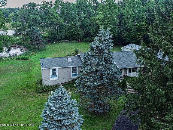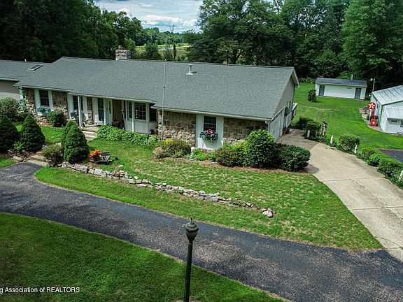 Country Ranch with over 3100 sq ft of finished living space, 4 bedrooms, 3 full baths on 3 acres with a pole building, additional storage and a pond. Beautiful fieldstone front on this home with side load garage and a spacious front porch. Front entry opens to the foyer tucked away from the living area. Large living room with bay window, gas fireplace with fieldstone surround. Kitchen and dining on the back of the home. Kitchen with lots of storage, including an island and pantry, appliances will stay. Three seasons room off the kitchen with deck access. Large dining area for gatherings, slider out to the deck. Down the hall to the large master suite, cathedral ceiling, ceiling fan, skylights, wide plank flooring and gas log fireplace. Large master bath with a whirlpool tub, separate shower and large walk in closet. Three additional main level bedrooms. Another 1300 sq ft finished in the lower level. Out back is pole barn, workshop and pond. Don't wait.