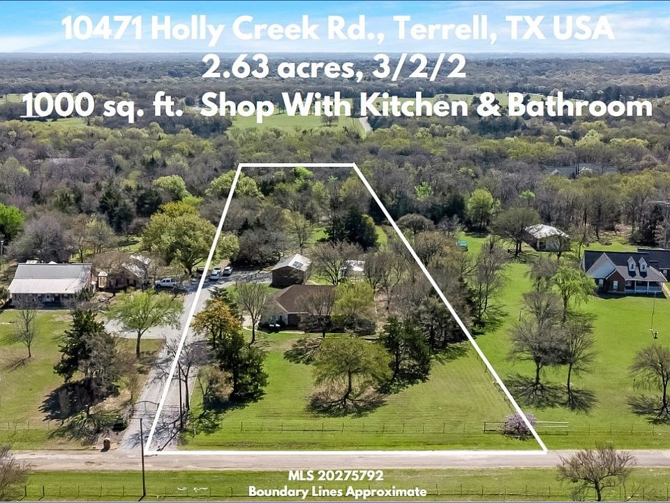 Here is a meticulously maintained mini Texas ranch, so if you are tired of the city, want room to homestead, but still need to be convenient to DFW, this may be your perfect piece of Texas. This home offers 3 bedrooms, 2 bathrooms, and an office or flex room, all on 2.63 acres with a gated driveway. The land has peach and pear trees and open pasture. All this is plus a WORKSHOP, GREENHOUSE and CHICKEN COOP so you don't have to think about the rising cost of eggs! The detached 1000 sq foot workshop boasts a kitchen and bathroom. Enjoy all the room for activities while being minutes to Rockwall. The home is located in a small private subdivision off the main road. There is a built in Tornado Shelter in the garage. Solar panels will stay with the home. Location is important and Hunt County is a destination for reasonable taxes. Don't wait, this won't last long. Information deemed reliable but buyer should perform due diligence. Graphic boundary lines are approximate.