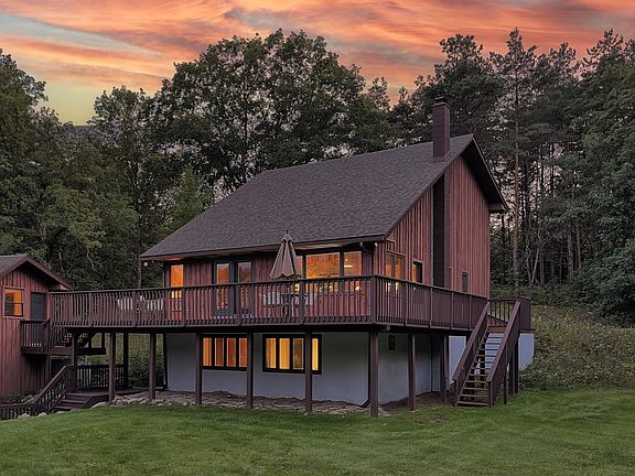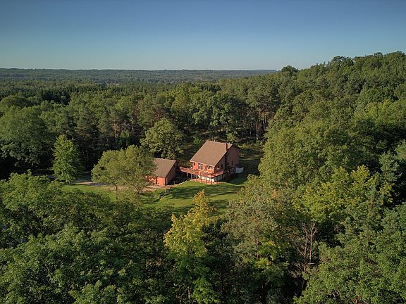 Beautiful private setting for the lodge that features 4 bedrooms, 3 baths and a walkout lower level that overlooks the crystal clear pond with fountain. The ridges and rolling terrain with mature hardwoods, red pine and young growth poplar with 2 potential food plot areas provides for great whitetail deer, turkey and small game hunting!