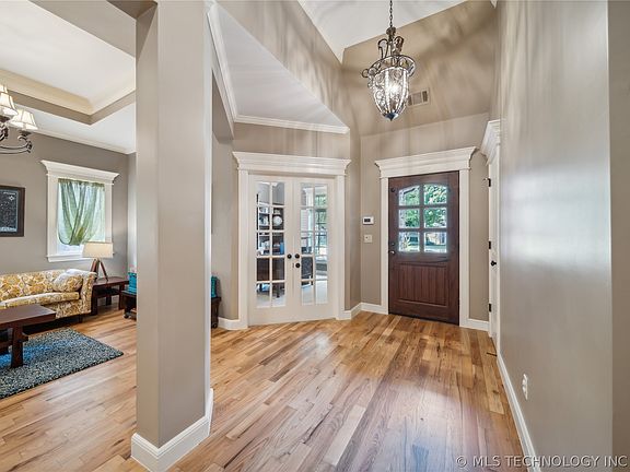 PICTURE PERFECT! JENKS SOUTHEAST SCHOOLS! Flexible floor plan on a quiet street; Office w/soaring beamed ceiling & built-ins, Formal Living/Flex Room w built-in bar area, Spacious living with gas FP opening to chef's kitchen w/granite, SS appliances, extra large pantry, additional storage closet for larger appliances and Breakfast nook; Primary suite down w/soaking tub, double vanities & split closet. Newly refinished hardwood floors that were changed to a lighter color, Plantation shutters. 3 Beds and Oversized game room up! Extra large laundry with lockers, desk/craft area and storage closet with a hidden door for extra storage. Newer climate-controlled sunroom overlooking the backyard oasis w/extended patio, pergola & firepit! Great backyard space for entertaining and for children to play.