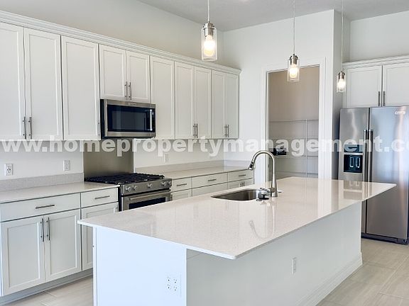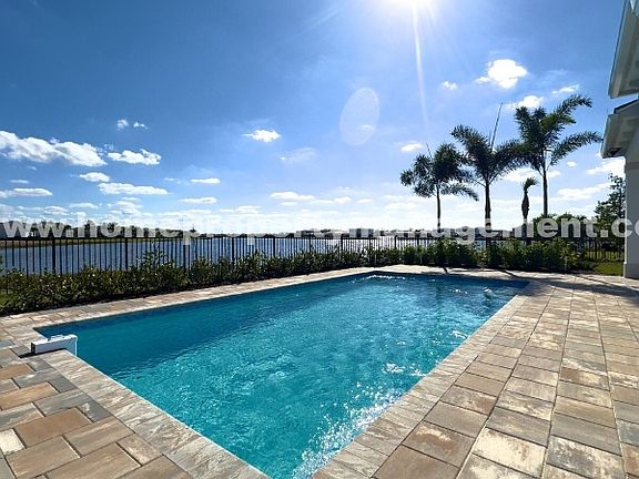This STUNNING WATERFRONT home has a fenced-in PRIVATE POOL that is situated on an expansive LAKE with breathtaking views during sunrise and sunset! This home features 3 bedrooms 2.5 baths and a 2-car garage. Tile floors throughout the main living area and carpeting in the bedrooms. The kitchen offers stainless appliances, white cabinetry, a large pantry, a gas range, and quartz countertops. The owner's suite features pool and lake views, a tray ceiling, and two walk-in closets. The spacious owner's bathroom has dual sinks and a walk-in shower. Adjacent to the owner's suite, enjoy the bright and airy OPEN-CONCEPT kitchen, caf , gathering room, and COVERED LANAI.