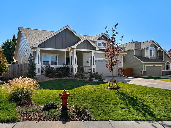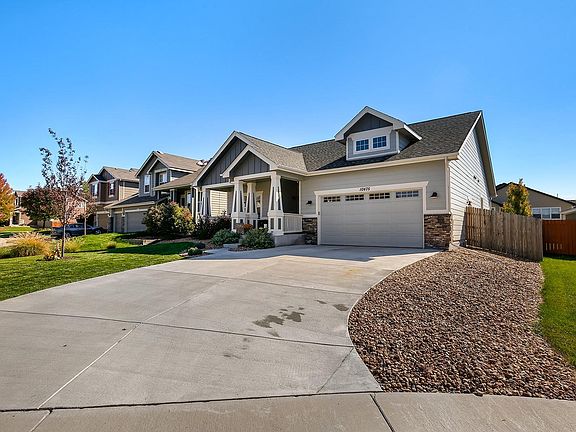Unique opportunity to own a stunning builder's contemporary craftsman-inspired ranch home with finished basement and entertainer's exteriors! Sitting on serene cul de sac, this immaculate home is just 2 yrs old, still holding a brand new feel throughout and boasting front/back mountain views. An inviting front porch leads the way to an open luminous layout with 9' ft ceilings, engineered wood plank flooring and shiplap trim. Great room features tray ceiling, custom fireplace mantel and built-in shelves. Gourmet kitchen with all S.S. appliances, granite countertops, brick backsplash, eat-in island and soft-close 42" cabinets with upper trim and lighting. Three main level bedrooms, including private master retreat with 5-pc bath and walk-in closet. Ample basement offers 2 guest beds, family room and huge storage room (could be 6th BD). Full surround sound pre-wire with wireless capabilities, gas line for grill, large deck and custom shed! Close to I-25, multiple shops and so much more!