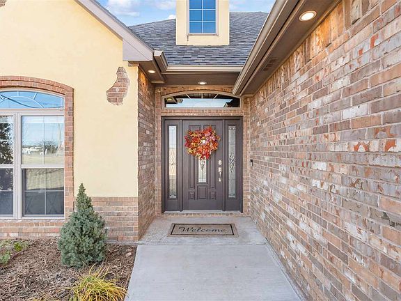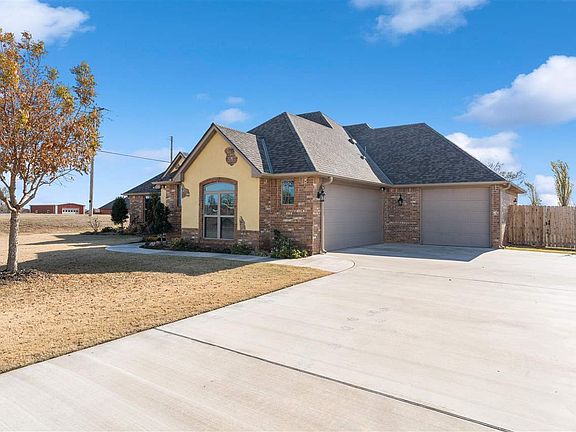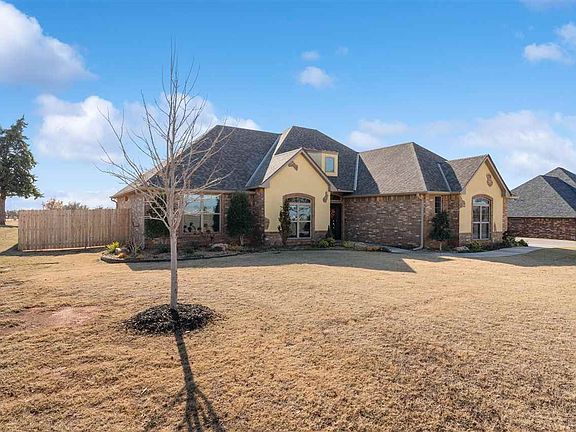 This one owner home is still like new and has approx. 2100 square feet of living area with 4 bedrooms and 2 baths plus 3 car garage. This property is located on a corner lot with approx 1.1 acres. Professionally landscaped with mature trees, and full sprinkler system. Owner has extended the patio and added a pergola plus backyard is privacy fenced. Open floorplan with natural gas log fireplace , cooktop and gas heat for energy savings. Eat in kitchen has a large breakfast bar with granite, custom built knotty alder cabinetry, stainless appliances, pantry and refrigerator does stay. The owner is also leaving the washer and dryer. Septic service agreement has been maintained during ownership and new roof was installed in 2023. Give listing agent, Julie Bridges Realtor with RE/MAX Professionals a call at 580 695-3883 with any questions.