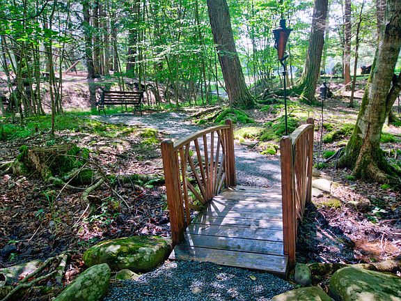Beaver Lake Technical Lakefront Chalet set on a very private .77 acre! A perfect setting w/a beach (community) on one side, a park & stream in the middle & the house on the other side. This home features the most charming outdoor oasis including sitting areas, a pond, fire pit, walkways & 2 bridges that cross over a stream to the lake. This immaculate, sun-filled 3 BR, 2 bath home has cathedral ceilings, skylights, T&G accents, & large sliders to a deck w/beautiful park/lake views & a shed. Bel Brazilian KOA HW floors are featured throughout the 1st FL along w/an open floor plan, kitchen w/a breakfast bar & a stone floor-to-ceiling FP. 2nd floor features a loft, & a large master suite. The lower level is perfect for entertaining w/a family room, 4th bedroom or office & walk-out to LL deck.