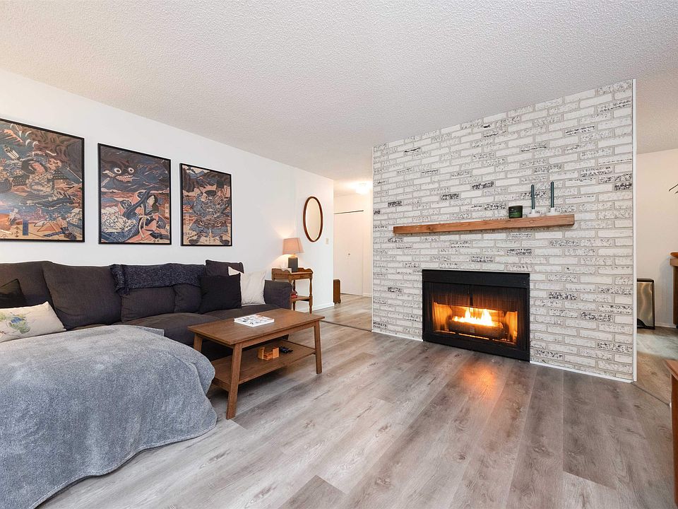 Large corner unitCozy gas fireplaceSeparate office nookUpdated flooringWell-maintained rain-screened building
