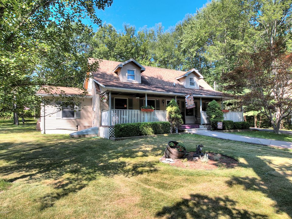 Beautiful Cape Home located in the sought-after community of Wallenpaupack Lake Estates(WLE). A gorgeous front porch welcomes you to this well maintained 4 bedroom,2 bathroom home. Social distancing is no problem here with a spacious family room, formal dining room & living room complete with a fireplace. The master bedroom suite offers an extra large walk in closet while all of the bedrooms provide ample space. Imagine yourself soaking in the jetted tub while sunlight fills the room. The double french doors lead to your private backyard where you'll find a deck & patio perfect for entertaining. There is plenty of room for parking a paved driveway & oversized 2 car garage complete with heat & a workshop. This beautiful home won't be on the market long!