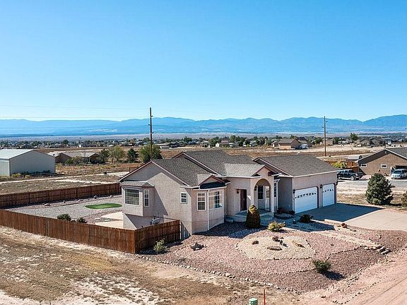Great Pueblo West acreage location with mountain views from front to back. See Pikes Peak from the covered front porch, and the Spanish Peaks and Wet Mountains from the huge covered back deck. Walk-out level below gives access from the lower level directly to the back yard. Behind the 1.15 acre property with partial privacy fenced yard, you have the paved walking and bike path that goes to the high school, and connects to other paved trails including Lake Pueblo, the Arkansas River and the Nature Center and City Park in town. High ceilings and large windows throughout the house bring the outside in. Spacious tiled dining and kitchen area would be great for entertaining. Master suite with bay windows has a large walk-in closet, huge bath with separate jetted tub and walk-in shower. Another bedroom, bath and laundry room complete the main floor. Downstairs you find another access to the back yard in a forced walk-out that is covered. Two bedrooms can share the full bath and there is family room the width of the house....all finished, and also with high ceilings. Attractive, low maintenance, landscaping. 3 car garage is fully finished. Furnace & AC replaced in 2013. Newer carpet in basement. Lots of living space for the money and a perfect back yard!
