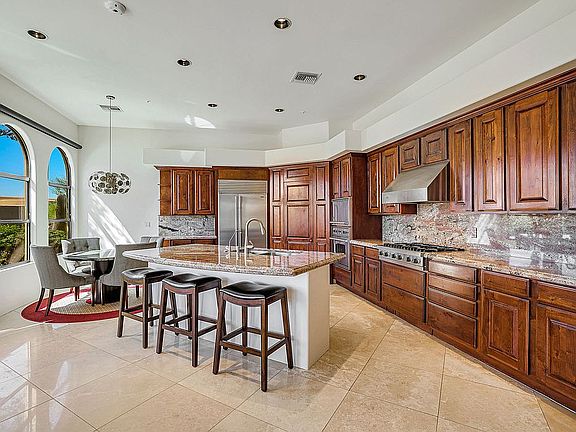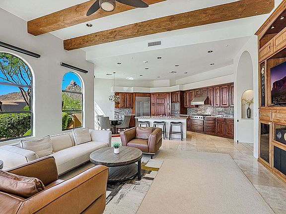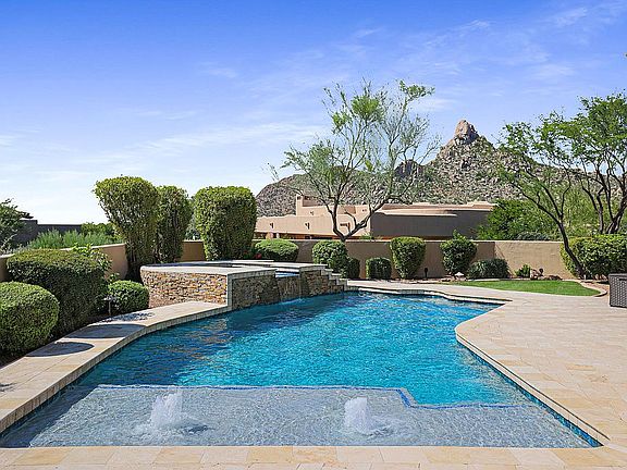 Elegant Mediterranean Estate in gated Troon Fairways has stunning views of Pinnacle Peak & Troon Mountain. Spacious 5,236 sf. custom home nestled on 1/2 acre+ lot. Travertine and new wood flooring (no carpet). Chefs Kitchen w/ granite countertops, opens to great room w/fireplace. Living Room w/wetbar and formal dining. Large master on main level, comfy seating w/fireplace, direct access to resort-like backyard. Negative edge spa spills into pool with baja shelf & water feature. Grass yard. Full covered patio, misting system & surround sound you can control by phone via Control 4 automated smart home system (controls: security, climate, lighting, shades & audio indoor/outdoor). Expansive guest qtrs (2nd master) above garage w/ mountain and city light views. All other bed & baths on main level
