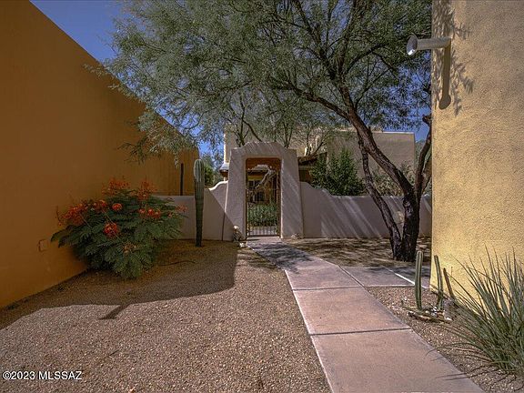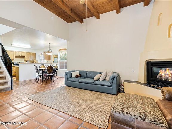 Welcome home to the highly sought after community of Civano. This charming 3 bed, 2 bath TJ BEDNAR home boasts a large great room w/high wood beamed ceilings & beehive fireplace; well-appointed kitchen & TWO owner's suites: w/one on main level. Mature fruit trees including Dwarf Meyers Lemon; Pink Grapefruit, Pomegranate & Calmondin Orange await you outside in your private backyard oasis w/extended covered patio, complete w/power sunshades for added convenience & comfort. Other features include detached 2-car garage, whole house water filtration & newly coated roof (5/2023). Conveniently located near the N pool, tennis courts, parks, community garden & other Civano amenities. Here's your opportunity to enjoy the serene lifestyle of this great home & community. Be sure & check all photos.
