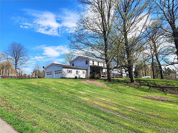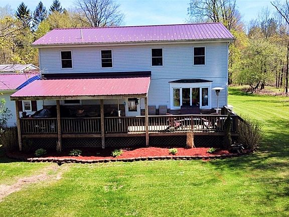 This beautiful 5 bedroom, 2 bath home w/ a 2 car garage, is situated on 5.5 acres among the gorgeous hills of West Valley. The extensive deck, surrounded by attractive landscaping, welcomes you to views of the peaceful & serene landscape. The 1st flr is complete with a LR, kitchen overlooking the family room, bedroom, full bathroom (new vanity commode) & laundry room (new exterior door and stairs). The kitchen features granite countertops, wood cabinets, new stainless steel farm sink & original hardwood floors. The living room boasts a new exterior door & screen, original hardwood floors, a pellet stove & a bay window, while the family room offers a pellet stove & original hardwood floors. The 2nd flr presents 4 sizable bedrooms w/ a full bath (heated towel bar). Powered by 30 Solar Panels & a larger Inverter capable for expansion & adjusted for each season. The excess goes into the grid, w/ elec. costs apprx $17/mo! This prime location offers easy access to winter recreation & the vibrant atmosphere of Ellicottville & the renowned Holiday Valley Resort, providing an ideal blend of outdoor adventure & entertainment just moments away from your doorstep. Offers reviewed as received.