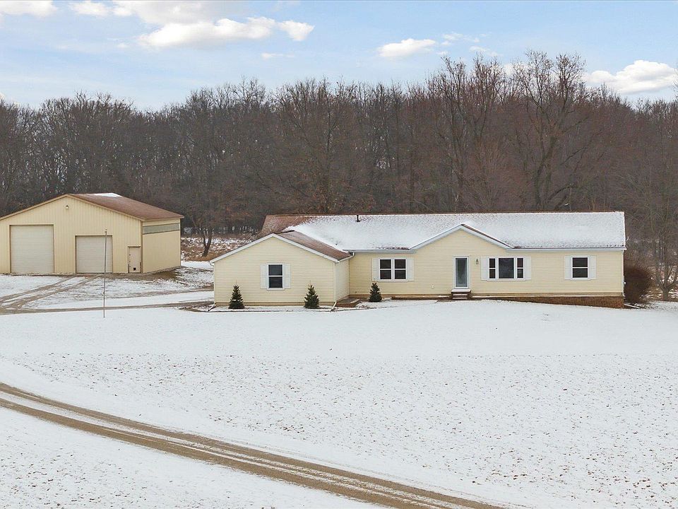 Escape to the country! You'll love the winding drive back to your private homestead, nestled on a serene 7.7 acre double lot. This 3 bed, 3.5 bath ranch unexpectedly boasts an additional 2000 square feet in the finished basement, including oversized rec room, full bath, and two bonus rooms for countless possibilities! The heart of this 2007 custom-built home is a thoughtfully designed kitchen with a sprawling 16-foot island, where the windows overlook the gently rolling fields and the neighbors pond that edge the backyard. Adjoining formal dining room and dual living spaces. All bedrooms feature spacious walk-in closets. Outside, the property hints at its former life as a hobby farm, with its spacious 40x48 pole barn and grassy acreage laid out perfect for pasture. Wildlife abounds, house is on a low-traffic rural paved road, making this a dream location for nature enthusiasts or those who just want a peaceful escape from the daily grind.