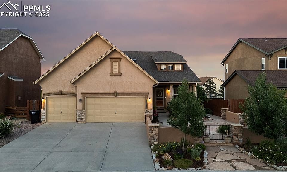 Welcome to this beautifully distinctive 5-bedroom, 3-bathroom home with a 3-car garage, nestled in the sought-after Meridian Ranch community. From the moment you arrive, you'll be captivated by its impressive curb appeal—featuring a stylish stucco and stone exterior, vibrant landscaping, elegant flagstone accents, and a welcoming enclosed front patio. Step inside to a spacious living room highlighted by a stunning fireplace, custom built-ins, and a modern barn door that conceals bonus overhead storage. It’s the perfect blend of comfort and sophistication, ideal for both relaxing and entertaining. The main level boasts rich hardwood floors and flows seamlessly into the gourmet kitchen—a chef’s dream. Enjoy an oversized island, abundant cabinetry, a pantry, and premium appliances, including two ovens, two microwaves, and two dishwashers—perfect for effortless cooking and entertaining. Adjacent to the kitchen is a generous dining area with sliding doors that open to a beautifully maintained Trex deck. An extra-wide staircase leads to the landscaped backyard, offering a seamless indoor-outdoor living experience. The main floor also features a spacious primary suite with a luxurious 5-piece en-suite bath, a second bedroom, a full bathroom, and a convenient laundry room with additional storage. Downstairs, the fully finished walk-out basement has been refreshed with new carpet and paint. It includes three additional bedrooms, a full bath, a large family room with surround sound wiring—ideal for a home theater—and a versatile workspace with custom built-ins, perfect for a home office, craft room, or study area. Outside, your private backyard oasis awaits—complete with matching flagstone, raised garden beds, a charming pergola, and a relaxing hot tub, creating the perfect retreat. With thoughtful upgrades throughout and located near top-rated schools, parks, and the golf course, this exceptional home truly has it all. Homes like this are rare—don’t miss your opportunity!