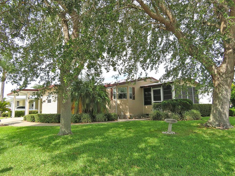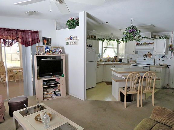 Great TWO Bedroom, TWO Bath home has a wonderful floor plan and great potential. Shady corner lot, wide carport, golf cart shed, breezeway to block the front door and give you extra shade. Laundry inside the home, dining area kitchen and living room are very open. Front porch has vinyl windows and a sidewalk that leads to the front door and parking area. FURNISHED. 2017 HVAC and 2022 ROOF.