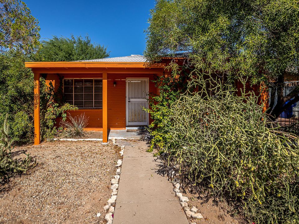 Cute as can be bungalow in NW University area. Lush desert landscaping and mature trees. Very sweet covered front porch. Updated full bath. Kitchen: lots of cabinets and shelves.Great room style opens to the living room and has a large dining area. Central A/C & newer plumbing, Shade-cloth covers the carport. Great location: convenient to Mitchell Park and U of A via Cat Tran and the bike path on Mountain. River Loop is also nearby Zoned R-2 ... lots of potential!