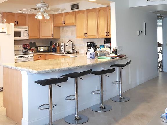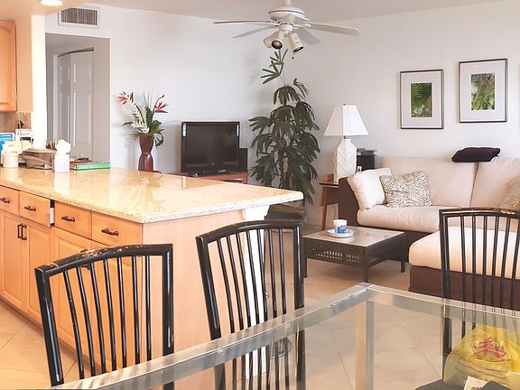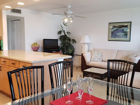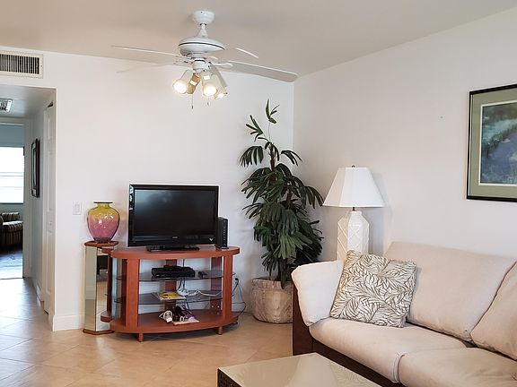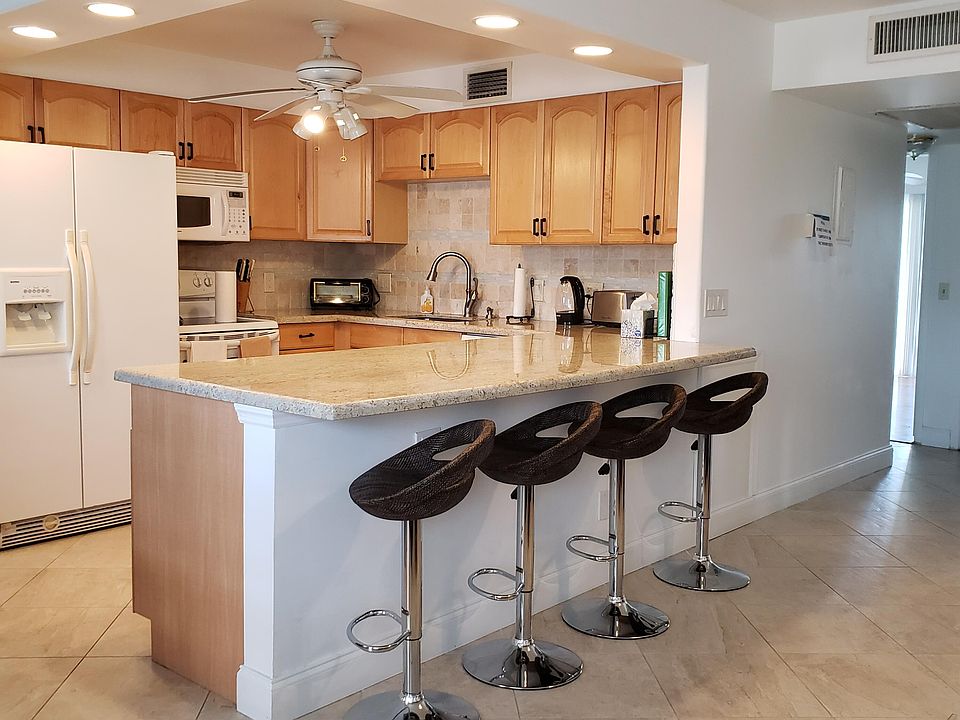 Bright spacious GROUND floor 2 bedroom 2 bathroom condo. Primary bedroom has a bathroom directly off the bedroom. Porcelain tiles throughout the living area and on the patio! Both the bedrooms have hard wood floors. The open great room has super space for a gourmet chef and bar stools for snacking at the granite counter. Bright recessed lighting and fans in every room. Come relax on the screened in porch overlooking the lake. Bring your clothes and enjoy the great clubhouse activities in this 55+ community.