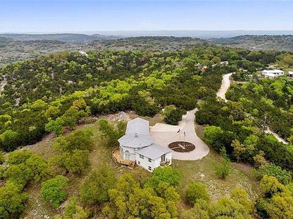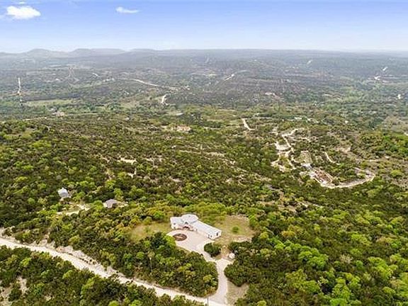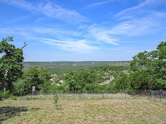 Enjoy stunning sunsets and starry nights from the deck of this gorgeous, private family compound at the top of a panoramic hill in Blanco, Texas. Light and heat protective awnings above deck. 360 degree fireplace in the center of an octagonal room w/ vaulted beamed ceiling. Over sized two car garage and fenced backyard. Attached guest apartment with powder room and private entrance . Energy conscious home. Radiant floor heating in great room. Electric has generator back up. Well water has conditioning and purifying system. RV hookups in front driveway.