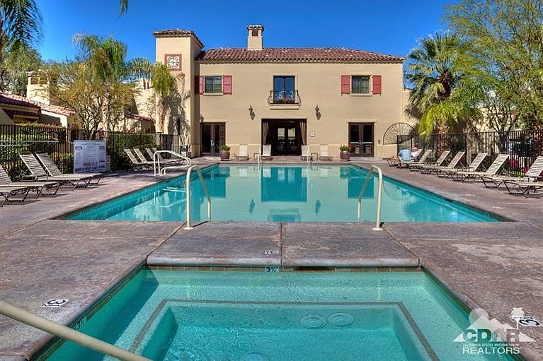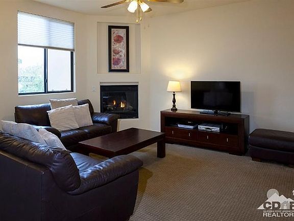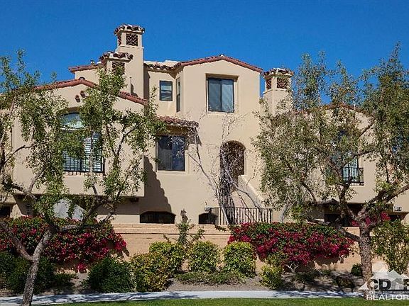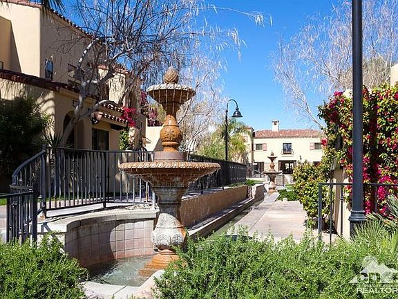 Villorrio is a gated community on land you own located within walking distance of downtown Palm Springs. This community offers resort style living with a community pool, several spas, & a well appointed fitness center. The ground level features an enclosed bonus room with full bath and mini split A/C unit and a private two car garage. Exterior stairs lead to the Level Two living room with fireplace, well appointed kitchen featuring dark wood cabinetry, granite tiles, & black appliances, and a pleasant casual eating area with access to a private balcony. There is a powder room on this floor. Upstairs on Level 3 are the two master suites, each with views, & private baths. A stacked laundry is on this level. Villorrio is lushly landscaped, with many amenities that include a clubhouse with kitchen area.