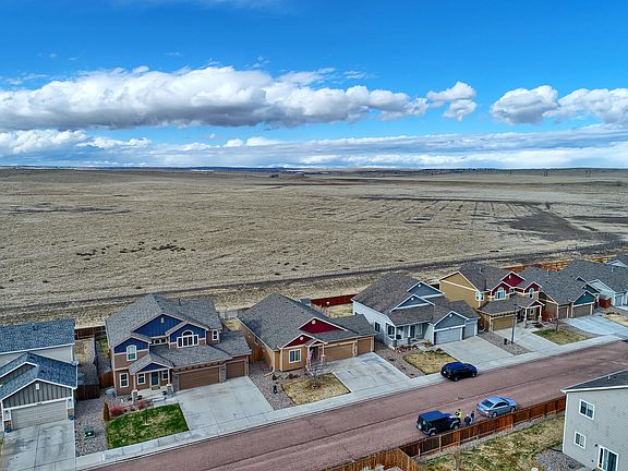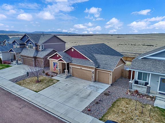 This well kept rancher sits just minutes from the Powers corridor and less than 10 minutes from Ft. Carson. Easy commute into the Springs, less than 15 minutes to downtown. Enjoy all the amenities of town while your home backs up to thousands of acres of open ranch land as well as a jogging/hiking trail which is easily accessible through the gate. Wide open concept kitchen and dining room area that adjoin to a large and functional living room. Master suite on the main with a 5 piece bath, tile tub and shower surround and floors. The master shower also has a tiled bench for convenience. Very tasteful upgrades throughout the home including a unique dining room hutch. Please notice it in the dining room photo, it is so well matched you would think the builder had this as an option but this was done by the owner! Garage features fully insulated (all walls to include exterior facing walls), painted floor, built in cabinets, work bench and 220 outlet. 3rd garage is 23' deep for big vehicles. The basement is huge with 2 large bedrooms and one more full size bath. Pardon the lack of photos of basement as pictures were taken during a move. The main room in basement is wired for 5.1 surround sound and a home theater projector. Also included with the home is theater style seating that matches the flooring and looks great in the space! Oversized stamped and stained concrete patio in the peaceful backyard for entertaining friends on those warm summer nights as well as a 220v outlet to hook up a hot tub! Lots of features that cost extra at the builder and ready for a quick close! Roof has been replaced in 2016 and the exterior of the home was professionally repainted as well. Come see the mountain views from the back yard!