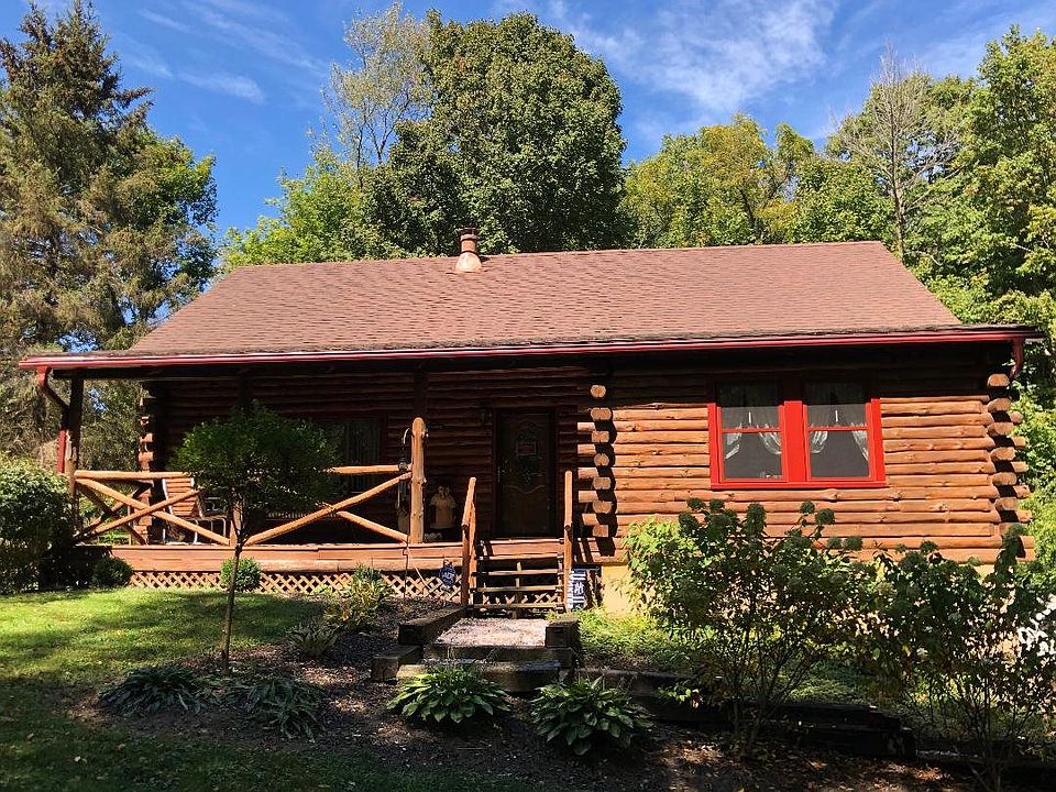 THE LOG CABIN YOU HAVE BEEN WANTING!! This cabin is situated on a lovely well maintained country lot. The front porch welcomes you to sit and chat for a little while, watch the wildlife at play. Upon entrance be welcomed by 2 cabin bear statues that will remain , there is a foyer that is situated in front of the stairway, go to the left and you have a large living room that offers a wood burning stove for your cold winter nights, the downstairs offers a half bath with laundry room shared. The kitchen has solid wood cabinetry with plenty of storage and all appliances remain . Then there is a family/dining area off the kitchen where you could easily entertain your guests. The stairs leading up to the second story are wide with a landing. 3 bedrooms are located upstairs with one full bath. The cabin has a deck area that wraps around the side and back of the property for peaceful evenings to just take in nature and the beautiful back yard. There is a 2 car garage on the lower level of cabin, that is also accessed off the kitchen and offers plenty of storage space or work shop space. Recent updates include , 1 electric panel was replaced with all new breakers and panel in 2017, all new windows with beautiful wrapping have been installed 2019, new covered gutters installed and new refrigerator 2018 . Plenty of cut firewood to stay with property. Logs have been treated every 3 months and well maintained by owner.