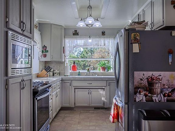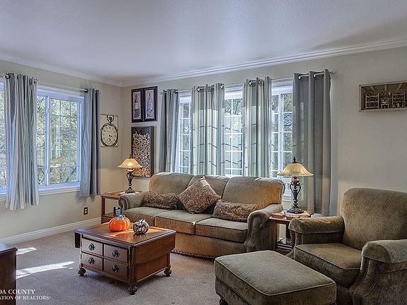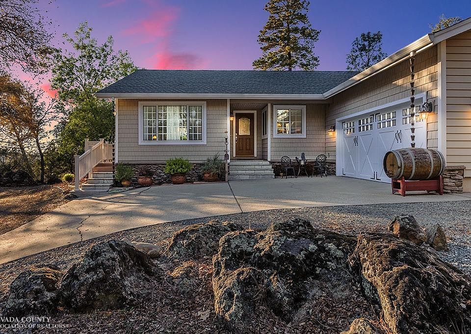 This beautifully appointed home sits atop a sunny knoll with a stellar view of the Nevada County sunsets. Enjoy a cocktail on the deck and take in the views. Inside the kitchen shares the view through the garden window and is light and bright and completely immaculate. In the kitchen subtle tile tones match the wood work and contrast with the stainless steel appliances. The bathrooms have been totally remodeled and feature water resistant laminate flooring. The master is also light and bright and has a sliding door that takes you out to the rear deck.The living room is warm and cozy and perfect for enjoying an evening at home. The family room doubles as a formal dining room if you desire. There are two auxiliary buildings to the rear of the home and plenty of room for your projects.