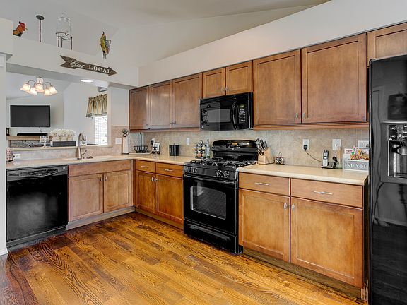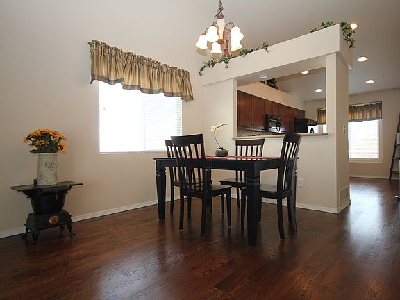 Move in ready Ranch home in great location in Meridian Ranch. Walking distance to the Meridian Ranch Recreation center. Great curb appeal on this corner lot. As you walk in you'll be impressed with hardwood floors throughout the main level. The kitchen offers stainless steel appliances, hardwood floors, tiled back splash, a large pantry and solid surface countertops You'll love the open concept on the main level with a cozy living room with gas fireplace, dining area and kitchen. Also on the main level you'll find the 2 bedrooms including a spacious master suite with walk in closet and 5 pc private bath, and an additional bedroom and a 2nd full bath. The lower level is finished with 2 bedrooms and a full bath, a large recreation area and and office area and a laundry room. The backyard is fully fenced in with a large paver patio and a second fenced in dog run. Great location in this master plan community!