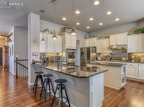 Wonderful Meridian Ranch home that features 4 bedrooms, 3 baths, an office plus a formal dining area with over 3,600 sqft. of living space. Gorgeous gourmet dream kitchen with a center island that includes a separate veggie sink, a large breakfast bar, granite countertops, double wall ovens, a gas cooktop with above stainless hood, a pantry and a breakfast nook. Much desirable open floor plan with gleaming hardwood floors that flow throughout most of the main level. The great room features a gas fireplace with aove flat screen tv nook plus a walk-out to the concrete patio. The office is conveniently located off the front on the home and the laundry is located off the garage and includes a utility sink and built-in cabinets. The spacious master retreat features a 5 pc spa with soaking tub, granite countertops, a larger walk-in shower and a nice size walk-in closet. A secondary bedroom and a full bath complete the main level. The lower level boast a large family room, a game room with wet bar, two additional bedrooms both with walk-in closets and a full bath with double sinks. Home is located on a large corner lot with privacy fence, a partial covered patio and wooden vegetable beds. Meridian Ranch is an amazing area that includes golf, walking trails, parks, recreation center with indoor and outdoor swimming pools. Conveniently located near military bases.