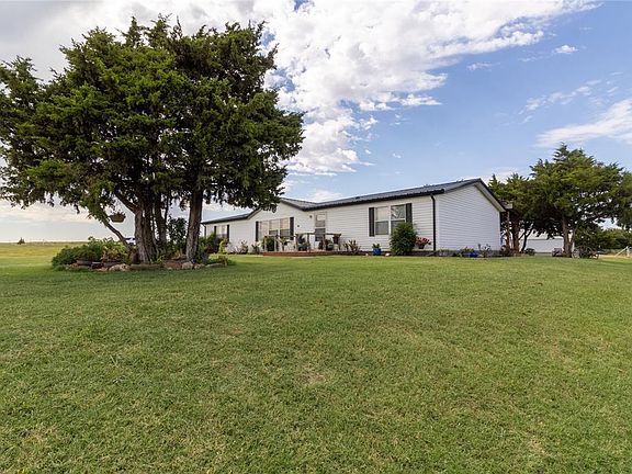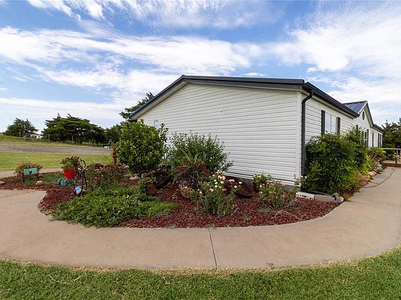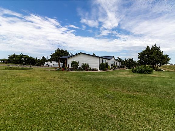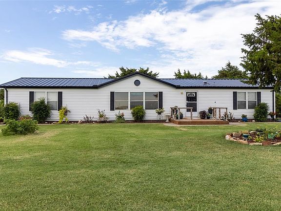 Peaceful country living awaits! Perfect place to sip tea on the massive covered back porch. This country charmer is on 2.23 acres located near a pond with mature landscaping and white siding with a metal roof! Split bedrooms plan with spacious living room! Kitchen has black appliances and island for extra countertop space. Large primary bedrooms with double sinks, garden tub, and shower. Outside features carport, storm shelter, storage building with lean to shed. The serene country living is just one call away! You must see it in person to appreciate!