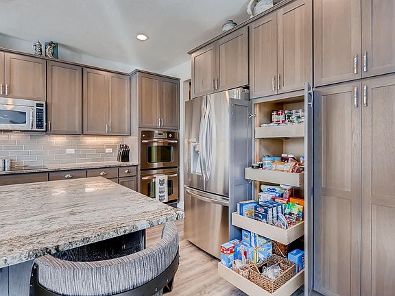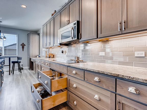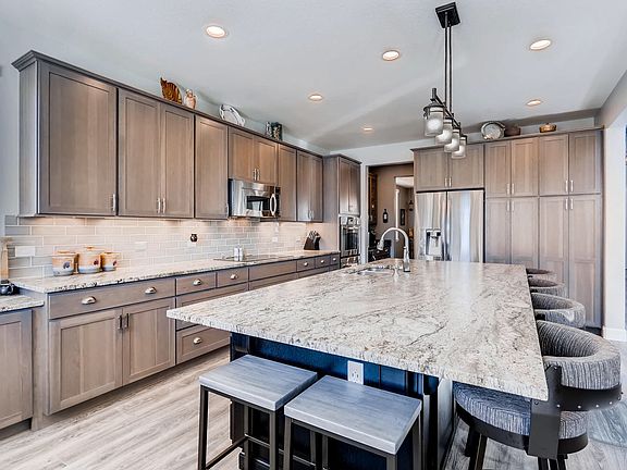 Unique design w/ rare main-floor master in Meridian Village! This stunning home has endless upgrades & impeccable finishes incl. vaulted ceilings,fireplace & new flooring on main level. You will love entertaining in All NEW Kitchen feat. leathered granite counters, oversized custom island, gorgeoussoft close cabinets w/ large drawers & pull out shelving, SS appliances, induction cooktop, BOSCH dishwasher & under cab lighting. Butlers pantry w/wine fridge. Spacious main floor master boasts coffered ceilings, walk-in closet & 5 piece ensuite bath. 2 addl oversized bedrooms w/ walk-inclosets, full bath & large loft upstairs. Finished walkout basement w/ 4th bedroom, bath & large storage room are steps from beautifully landscapedexterior. Relax on 12x20 Trex deck w/ covered pergola & roll down shades. Low-main backyard feat. stamped concrete patio, flower beds & 2 raised garden areas w/ dripsystem. New interior paint, upgraded lighting, built in surround sound & storage galore.