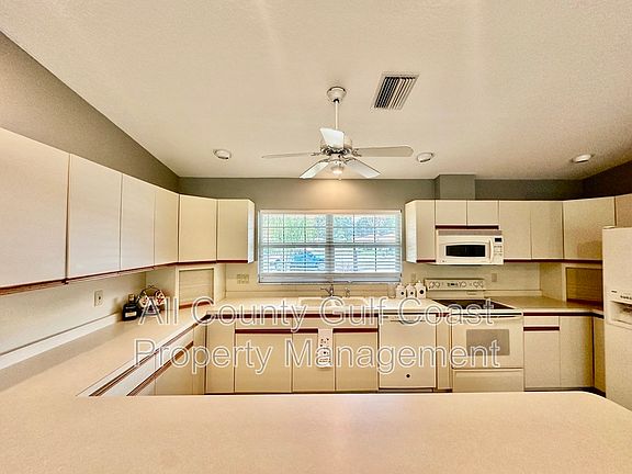 Welcome to your new home in The Palms of Manasota - a vibrant 55+ community in Palmetto, FL! This spacious 3-bedroom, 2-bathroom residence is available immediately for an annual lease, either unfurnished or partially furnished. Upon entering, you'll be greeted by a bright and open floor plan with neutral tones and soaring cathedral ceilings. The massive kitchen is perfect for entertaining or preparing delicious meals and seamlessly flows into the living area. A large slider opens to a private screened-in lanai with tranquil nature views. The master suite, located at the back right of the home, offers generous space and includes a private ensuite bathroom with a walk-in shower and a sizable walk-in closet. The second and third bedrooms are situated on opposite sides of the home, with one at the front right and the other adjacent to the second full bathroom at the back left. Additional features of this home include a one-car garage, an in-unit washer and dryer, storm shutters, a large corner lot, and more. Come see it today! - Lawn care included. - Pets with owner approval; Pet fees would apply - Move in with a first month + security deposit As per HOA guidelines: - One member of the household must be 55+ - No one under age 18 may reside in the community