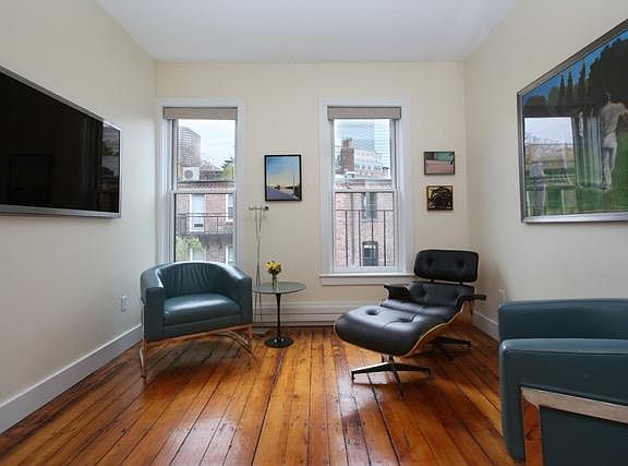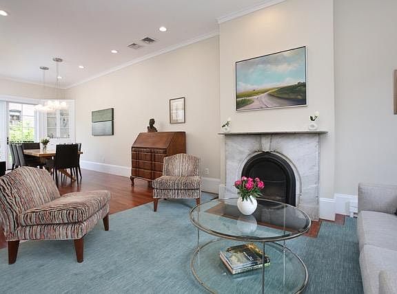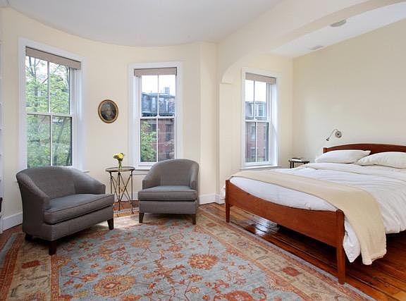 Elegant and updated upper triplex with central air and in-unit laundry. Enter on the parlor level to a beautiful open-concept kitchen, dining and living area. The chic living room boasts high ceilings, a curved bow-front with oversized windows and original marble decorative fire place. Beyond the dining room french doors open to a private balcony.The updated kitchen features fresh white cabinets, with granite counters, and a gas range. The primary suite is located directly above the parlor level and features a large alcove, bow front windows, and an oversized walk-through closet and separate private sitting room. Above the primary suite floor are two additional well-proportioned bedrooms and full bathroom. The triplex is topped with a large private roof deck, with spectacular views, electricity and running water. Available SEPT 1. First, last, one month's brokers fee required.