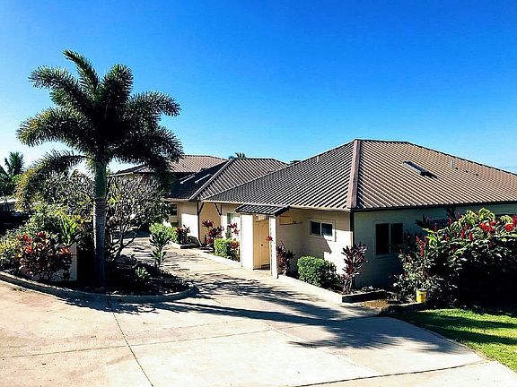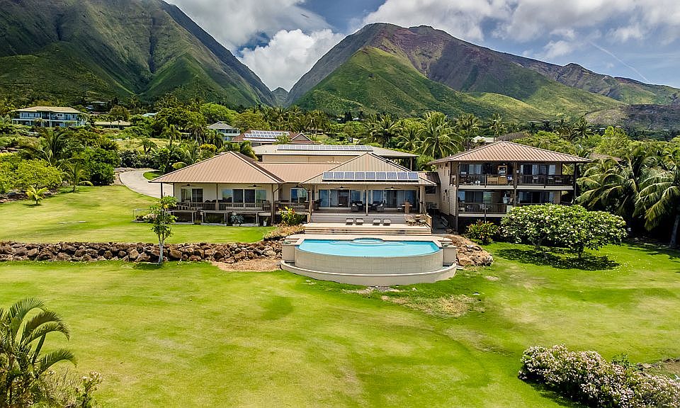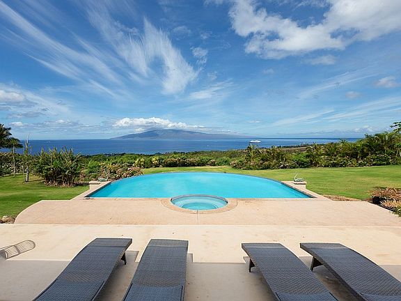 This large beautiful estate in Launiupoko has spectacular open ocean, mountain and outer island views as well as privacy. Extraordinary views extending from the three outer islands Molokai, Lanai and Kahoolawe! This beautiful main house is 5 bedroom 6.5 bath, 5222 sq ft interior space and over 8000 total sq ft under roof for the ultimate indoor and outdoor living accommodation. A partially finished 2880 square foot out building is a great bonus on this estate. The five bedrooms are large, all en suite with large covered private lanais, wet bars /kitchenettes and excellent ocean views. The flexible layout of the house was designed as a B&B and could be used either for a large family or rental income. The main house is conforming as a single family dwelling but the design with all en suite bedrooms having kitchenettes affords complete segregation of attached ohana style spaces with separate entrances. The large kitchen with new granite tops has a pantry for extra storage area. There are several bonus rooms that could be used as office, media or additional bedrooms. The lot is 2.58 acres and includes a large garage/agricultural barn with carport covered parking for 10 vehicles and additional parking for at least 20 vehicles on the large concrete drive areas. The barn includes 2880sq ft plus a loft area. Interior space has a large open area, full bath, kitchenette, laundry room and other storage rooms and a loft. This auxiliary structure is a car collector's dream come true and offers multiple uses such as equipment storage ,entertaining, RV and boat storage. Another separate area has a two car garage. Covered carports one each end will house 8 vehicles. The 2.58 acre lot currently has potential to be subdivided by a CPR to sell off separately or to build an additional ohana structure. Extra lots are selling at approximately $1m. The lush mature landscape produces an abundance of grapefruit, lemon, lime, papaya, banana, coconut, and avocado providing an abundance of fruit year round. The mature lawn, garden and orchards wrap around the home providing complete privacy. Located at the bottom of the lot is direct access to a neighborhood paved walking trail that goes for miles in each direction. Electricity is supplied by a privately owned 92 panel PV system. This property has had many upgrades and is in move in condition. The house comes completely furnished. This expansive home is perfect for a large family, construction business owner, and or rental income. A must see in one of Maui's finest neighborhood.