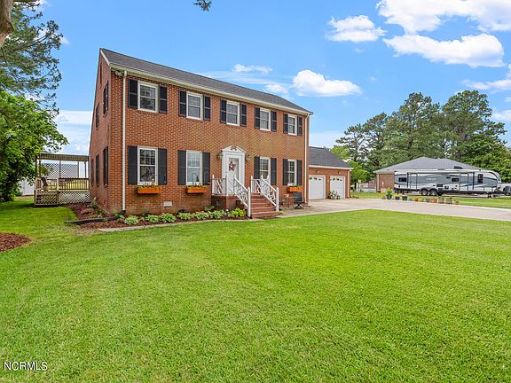 Wonderful brick 2 story home directly across street from Pasquotank River with an unobstructed view. 4BR 3bath with lots of room inside and out for casual or formal living. Views of the river or beautiful Weeksville farmland in a wonderful neighborhood with no HOA and this property is in Flood Zone X (no flood insurance required). LR, DR, Kitchen open to den with fireplace. Downstairs bedroom and bath plus sunroom. 3 car garage with 1 car space as a workshop. Back deck overlooking beautiful wheat fields. Quiet and friendly neighborhood! Extra concrete RV parking pad with 30amp plugin dedicated to the RV.