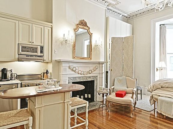 Exceptional studio apartment with wonderful Back Bay charm adjacent to the Public Garden. This home has tall ceilings and hardwood floors which combine classic detail not seen in many condos. Oversized mantel with working fireplace, bay window and amazing chandelier add to the period detail this unit has to offer. One flight up the dramatic stairway and enter thru beautiful arched doors to your haven. Full kitchen and moveable island are perfectly proportioned in this studio. The marble bathroom adds further elegance to this gem. Laundry in building Professionally managed building with low condo fee.