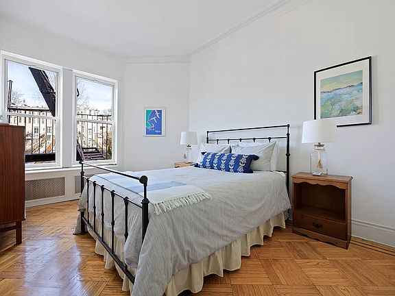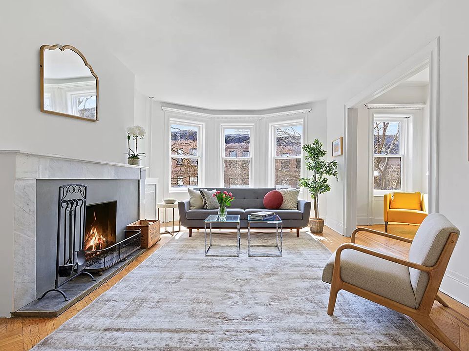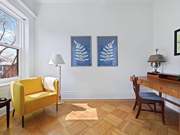 Experience the elegance of this finely-appointed 3 bedroom 1 bathroom co-op apartment with an office alcove on a prime Park Slope block. Located in a stunning 4-story, 4-unit brick and limestone building, the spacious gem blends the classic character of original details with high-end contemporary style. Generous interiors are bathed in natural light from abundant windows and enriched by lovely hardwood floors, tall airy ceilings, and tasteful moldings and millwork. The gracious living room with sunny bayed windows is ideal for relaxing and entertaining, centered by a huge wood-burning fireplace with a striking Carrera marble mantle. Flanked on one side by the bright and roomy office alcove, ideal for working remotely and on the other by the dining area with corner china closet. Prepare meals in the beautiful white and blue windowed kitchen featuring tiled flooring, abundant cabinetry and counter space, and new stainless steel appliances. The three large bedrooms are very inviting with excellent closets. Plus you'll love the convenience of in-home laundry with your own washer and vented dryer. 105 Berkeley Place is a handsome boutique pet friendly cooperative with a new boiler, shared garden for residents, and storage in the basement. Its premier location is off of 6th Avenue, moments to the shops, restaurants and services along vibrant 7th Avenue. Also nearby is Grand Army Plaza and the weekly greenmarket, amazing Prospect Park, The Brooklyn Museum, Brooklyn Library, Botanic Garden, Union Market, and the 2/3/B/Q subway trains.