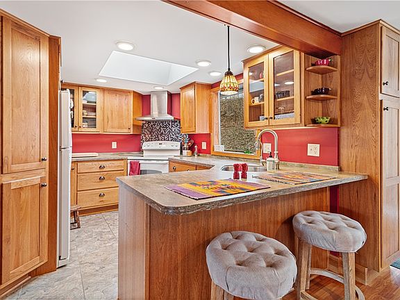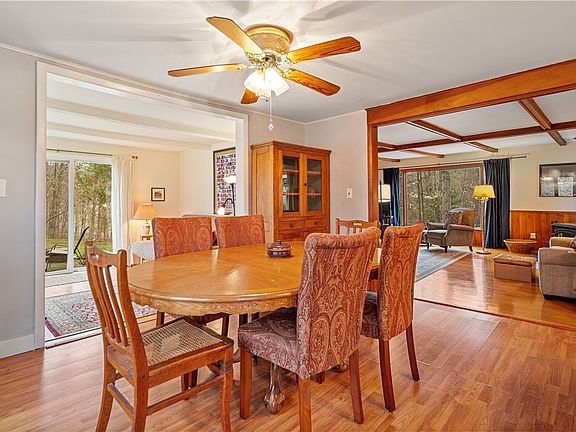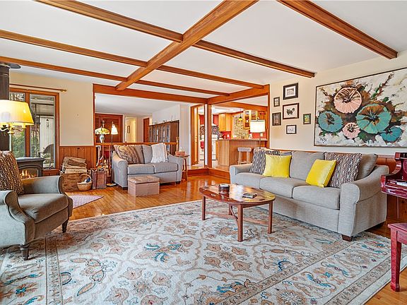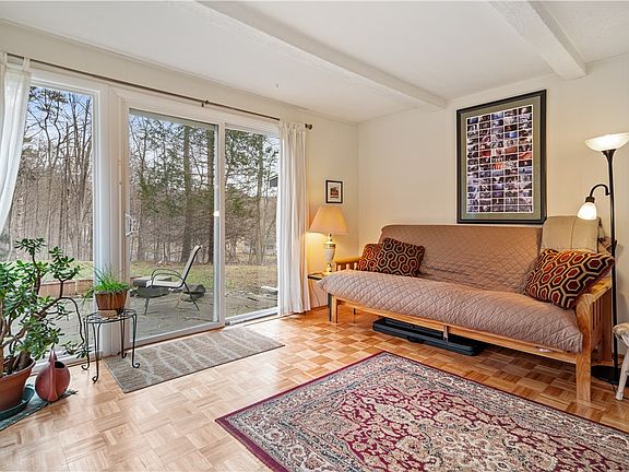 A retreat for all seasons! Escape to this sophisticated hideaway set among terraced gardens, mature trees and stone patios. Hillside ranch just minutes from Cornell and IC in a desirable Brooktondale neighborhood.  Light pours in this contemporary home to large open rooms w/ hardwood floors, Hearthstone wood stove & many windows to enjoy nature's splendor. This home is perfect for entertaining: open, bright and idyllically set for gatherings inside & out and a piano for fun. Two bedrooms, two full baths plus office and laundry on main level. Kitchen smartly updated by KZ Designs in 2018 with Corian counters, skylight, open counter seating with workspace for more than one cook.  New bedroom installed by Sunnybrook 2024 on lower level. New electric air source heat pump for heat and A/C installed by Snug Planet in 2022 - be independent of fossil fuels! Tucked behind the house is a stone building, perfect for potting shed, play house, or a writer's/artist's studio. This is the home you want to settle into this summer.