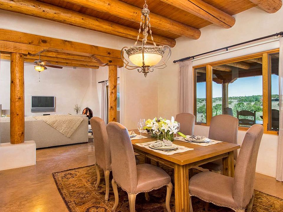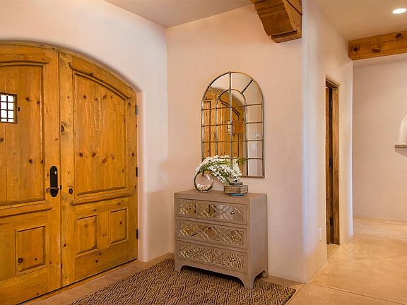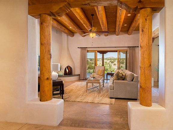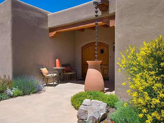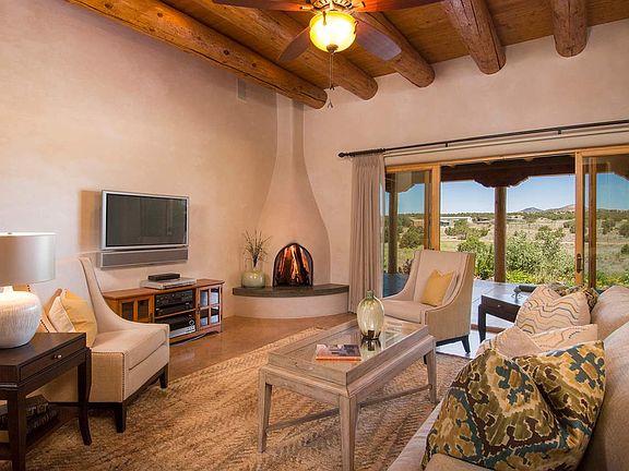 This striking East Ranch custom built home (2005) is a combination of soft contemporary and Santa Fe style with wonderful views. Butterflies welcome you to the home's entry patio which is xeroscaped with drip irrigation and cistern (4000 gal) . Enter thru hand crafted custom doors to this 3,075 sf.ft, 3 Bedroom, 2.5 bath on 2.27 +/- acres. High ceilings, large picturesque view windows, diamond plaster walls, vigas, arched doorways, nichos, stained polish concrete floors throughout, radiant heat, sky lights, CAT 5 wiring, large laundry room with walk-in pantry and built in storage and over sized heated 2 car garage with direct entry. The living room has a kiva fireplace and lots of space to just relax - it opens into the dining room and looks into the kitchen with it's stainless steel appliances, abundance of counter space and is complete with a center island and a sitting area for your cup of coffee in the morning. Bedrooms are separate and the owners suite has a kiva fireplace and outside access to portal and enclosed hot tub. There is a walk-in rain forest shower and jetted bathtub and walk-in custom closet. Built with energy-efficient construction - the exterior walls have 6 inches of insulated concrete with stryoform on each side. Home has environmental features which include rainwater recovery with 6 zones using a water recovery system. This home is already pre-inspected and ready to move into. Call and schedule your showing today!