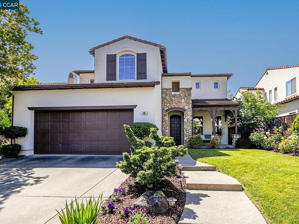 Sunny kitchen & family room backing to single story home behind. Charming front porch with stone accents. Kitchen has new stainless steel appliances & a granite slab island. Primary bedroom suite is on the main level. Upstairs are 3 bedrooms plus a huge bonus room. Bed 4 is office with built-in cabinets and desks – perfect for remote work or school homework. Wood flooring in living & dining rooms. Conveniently located near the main park with tennis, basketball, soccer, playground equipment and more. Low HOA dues include community swimming pool.