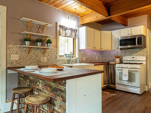 Nestled in the idyllic countryside of Appleton, Maine, this charming 2-bedroom Cape-style home offers a serene retreat for those wanting to embrace easy living. Tucked away in a private, rural setting, the property spans across 5.6 predominantly wooded acres, providing a perfect blend of tranquility and natural beauty. Upon entering the home, you'll appreciate the open and connected relation between the kitchen and living room; featuring exposed wooden beams and pine ceilings; a theme that carries throughout the home, adding a sense of warmth and connection to nature. The kitchen features a double-bowl farmhouse sink, tile backsplash, and butcher block counters. With ample cabinet storage, open shelving, and a breakfast bar, this kitchen is ready to serve as the central hub or gathering place with family and friends. Down the hall from the kitchen is a full bathroom, tastefully finished with a modern touch. Across the hall is a sizeable laundry room that has potential to double as an office or perhaps 3rd bedroom. With the recent installation of a new 3-bedroom septic system, you're all set. The two upstairs bedrooms with exposed beams and pine-clad cathedral ceilings provide a cozy retreat for peaceful slumber. The house is neat as a pin and cute as a button, but you're definitely going to want to embrace the outdoors. Just over 5.5 acres of natural therapy await to boost your energy and calm your soul. The property extends into a tranquil woodland, inviting exploration and connecting with nature. If that's not enough, take advantage of walking along Appleton Ridge or nearby hiking trails such as the Appleton Preserve that winds along the St. George River. Play golf or disc golf at the West Appleton Country Club in one of the most picturesque towns in Midcoast Maine. Come see why this efficient and manageable home within 25 minutes of coastal amenities could be just right for you!