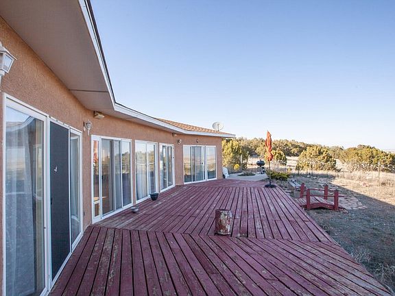 Private quiet secluded home on 5.2 acres with a view of Estancia Valley and wildlife for miles and miles from the east facing deck or the large living room windows. The home sits on a county-maintained road with pinons, cholla, and very interesting rock formations. Albuquerque and Santa Fe are both just an hour away. The home is fully tiled with no carpet. Bedrooms are the same size on opposite sides of the home with identical 3/4 baths. Great room in between the bedrooms with a propane fireplace. Seller-owned propane tank with radiant heated floors. The house is wired for A/V and outdoor patio speakers. Lots of room for horses, goats, chickens, sheep or other farm animals. Water cistern for additional water flowing from the well so always plenty of water.