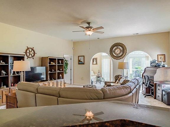 Beautifully maintained this 3 bed, 2 bath is waiting for you to call it home. Living room and dining area feel like one big room and overlook the double archways leading to the bright and airy Carolina Room with 11 ft. ceiling. This home has plenty of natural light between the large windows and the double sliding doors in the Carolina room. The kitchen overlooks it all with granite countertops, upgraded cabinets with pull out shelving, breakfast bar and a large pantry. This adjoins the breakfast nook and overlooks the entire living area. If you like an open floor plan you need to come see this one. The master bedroom has a big walk in closet, ceiling fan and tray ceiling. The bath boasts dual sinks, large vanity with storage, a large linen closet and garden tub with shower. The other 2 bedrooms are in front of the home along with a full bath with a step in shower. Located on a large corner lot, the back half circle patio has a 16 foot Sunsetter remote control awning complete with lights and mature landscaping as a border. The lush lawn has a sprinkler system. Oversized double garage has an epoxy floor, pull down attic stairs, and cabinetry that fills one wall complete with upper and lowers and a counter top. New HVAC 2018, new hot water 2019. Neighborhood amenities include the large pool with pavilion, tennis courts, bocce and a children's playground. Arrowhead is centrally located with easy access to 501, 17 and 31 and close to Coastal grand mall, restaurants, attractions and just 10 minutes to the sandy beach. All measurements are approximate and should be verified by buyers.