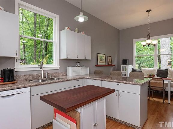 Light & bright home on a beautiful wooded lot. Hardwood floors throughout living areas. Spacious, open living & dining rooms are perfect for entertaining. French doors open onto screen porch. High ceilings throughout main level. Eat-in kitchen w/ granite countertops & gas range. Master bedroom has cathedral ceiling, en-suite master bath w/ linen closet. Ample closet space throughout home. Wired, stand-up crawl accessed from outside - great workshop/storage space. Quiet neighborhood minutes from UNC.